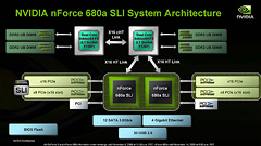 そして,「NVIDIAは16レーンと8レーンを推奨する」という,冒頭の話に戻るわけだ。16レーン×2(や8レーン×2)の場合,2枚のグラフィックスカードでデータの同期を取るためには,いちいちCPUを介さねばならず,パフォーマンスで不利になることが予想される。そのため,これまでの「16レーン×2が真のSLI」という主張を曲げ,NVIDIAはnForce 680a SLIにおいて16レーンと8レーンの組み合わせを推奨しているのだろう。