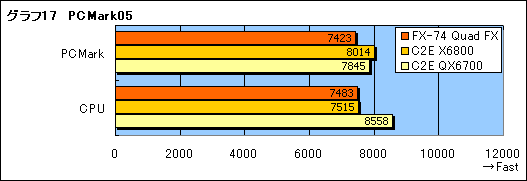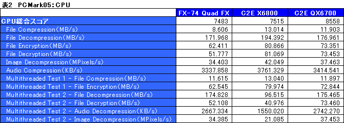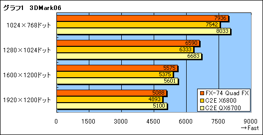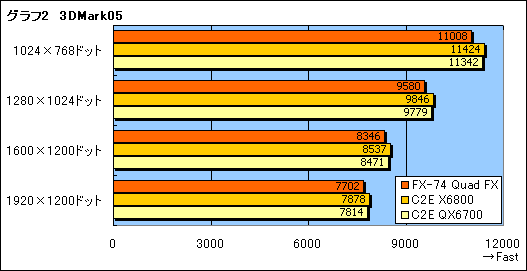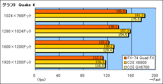 また細かい話だが,以下スペースの都合で,グラフ内に限って,Athlon 64 FX-74のQuad FXシステム,Core 2 Extreme X6800,Core 2 Extreme QX6700は,順にFX-74 Quad FX,C2E X6800,C2E QX6700と表記する。