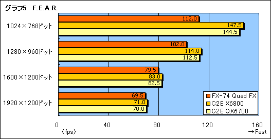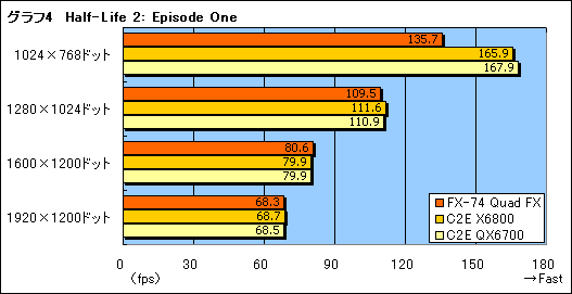 「Half-Life 2: Episode One」や「F.E.A.R.」(Version 1.08)も,Quake 4と同じような傾向を示す(グラフ4,5)。このクラスのCPUを使って1024×768ドットで一人プレイメインのFPSをプレイするケースというのは確かに少ないかもしれないが,それにしても,直接のライバルとなるCore 2 Extreme QX6700に30fps前後置いて行かれているのはちょっと苦しい。