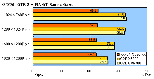 「GTR 2 - FIA GT Racing Game」(以下GTR2)になると,地力の差はより顕著となる(グラフ6)。60fps出ていれば合格なので,問題ないといえばないのだが,それでも,1920×1200ドットにおいて12fps近く差を付けられているのはいただけない。