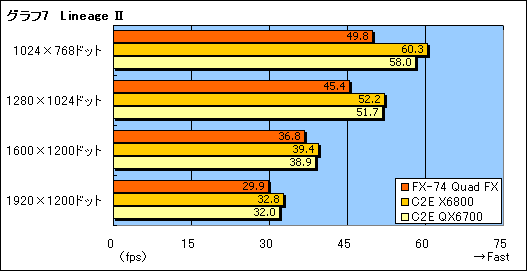 「Lineage II」のテスト結果も,GTR2と同じ傾向だ(グラフ7)。マルチスレッド対応でないゲームでは,1コア当たりの性能の違いが如実に出てしまっているように見える。
