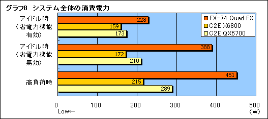 2個のデュアルコアCPUを一つのパッケージに収めたCore 2 Extreme QX6700でも高負荷時の消費電力は289W,それに対してデュアルCPU構成のQuad FXは451Wで,ほぼ1.5倍。デュアルCPU構成のデメリットが露骨に出てしまったといえるだろう。