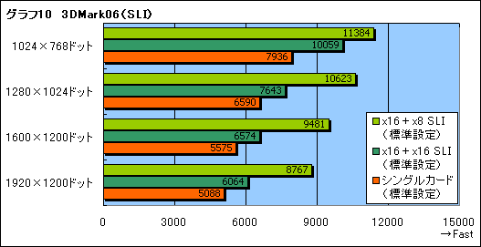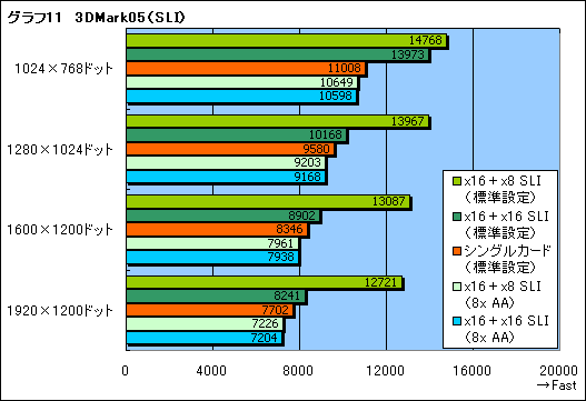 グラフ10は3DMark06, グラフ11は3DMark05のテスト結果だが,NVIDIAの主張どおり,x16+x8 SLIが,x16+x16 SLIに対して大きく差を付けているのが分かる。