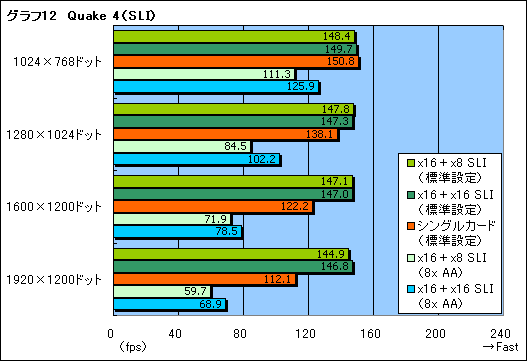 グラフ12のQuake 4では,x16+x16 SLIのほうが,わずかではあるものの,x16+x8 SLIよりスコアが高いのだ。体感では差のないレベルとはいえ,少なくとも3DMark06/05とはまるで毛色の違うグラフになっているのは確かである。