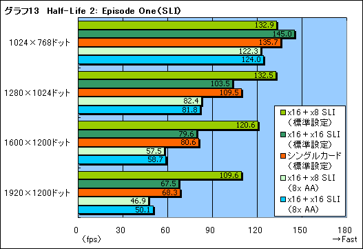 一方,3DMark06/05と同じような傾向を見せたのがHalf-Life 2: Episode Oneである。ここでは,x16+x16 SLIは,1280×1024ドット以上でSFRに切り替わり,一気にスコアを落としている。言うまでもないことだが,x16+x8 SLIは,1920×1200ドットでもAFRだ。