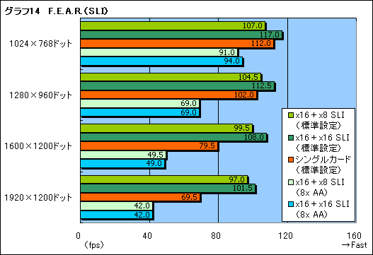 グラフ14はF.E.A.R.のテスト結果だが,明らかに,x16+x16 SLIのスコアが優勢となっている。