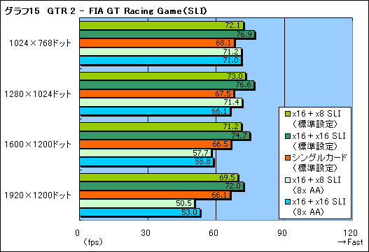GTR 2 - FIA GT Racing Gameも,なかなか興味深い結果を示した。同タイトルでは,1280×1024ドット以上だと,SFRへと自動的に切り替わったのだが,それでもx16+x16 SLIの優位性が保たれたのである(グラフ15)。扱うデータ量が少ない,比較的軽いゲームでは,帯域の広いx16+x16 SLIのほうが有利なのかもしれない。