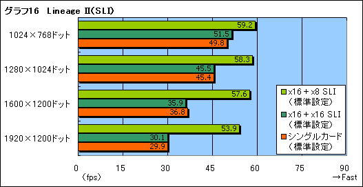 最後に,CPU負荷の高いゲームであるLineage IIでは,SLI動作にCPUを介さざるを得ないx16+x16 SLIが大きくスコアを落とした。実は,グラフィックス描画負荷が低いこともあって,x16+x16 SLIはテストしたすべての解像度でAFRレンダリングが行われたのだが,SFRに切り替わらなかったとしても,スコアが落ち込むケースはあるようだ。