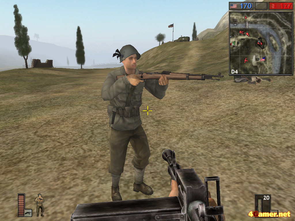 オリジナル版には日本,ドイツ,アメリカ,イギリス,ソ連の5か国を収録しており,兵士の装備から登場兵器まで国に準じている。プレイヤーは一般の兵士だが,"搭乗兵器"として戦車やジープなどの戦闘車両,さらには航空機,あろうことか軍艦や空母まで全35種類以上の兵器が登場する。戦場に配備されているこれらの兵器に乗ると,プレイヤーはその場で戦車や戦闘機や戦艦になってしまうのである。もちろん戦車に搭乗したプレイヤーはその機動力で戦場を蹂躙し,砲をドッカンドッカンぶっ放して敵兵を蹴散らせる。攻撃機は空を自由に飛び交って泣き叫ぶ兵士の頭上に爆弾を撒き散らせるし,戦艦は男らしくそそり立った砲塔で敵陣に艦砲射撃を行なえるのだ。サバゲ愛好者の中には本物のジープや張りぼての戦車を持っているマニアもいるようだが,さすがに空母を持ってるマニアはおるまいと思う。これはもう,PCゲームならではですな。