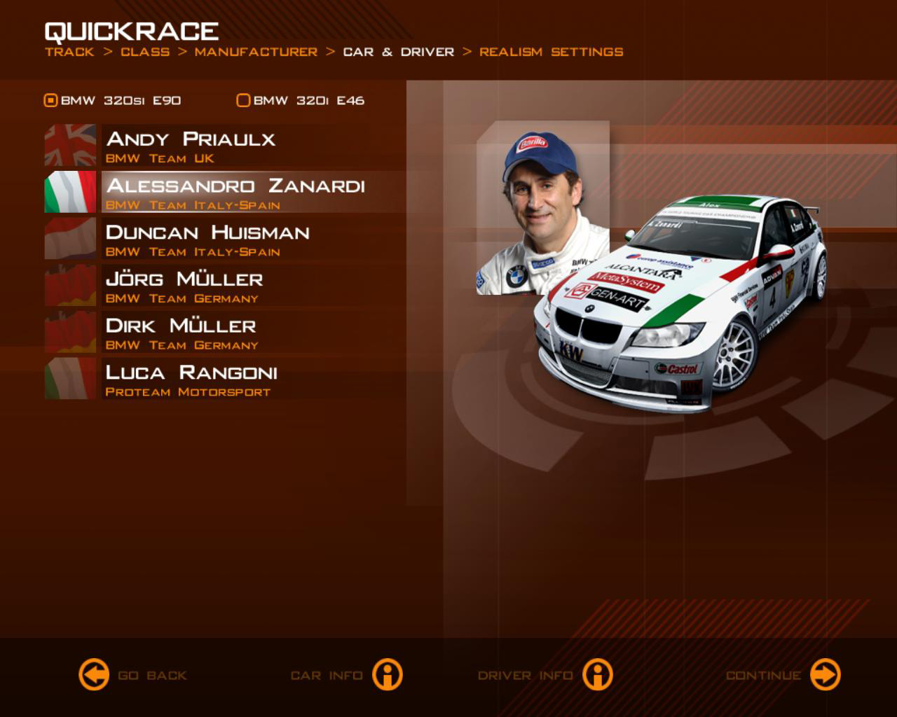 本作「RACE」では,そのWTCC 2006年シーズンがキッチリと再現されている。もちろんFIA公認なので,チーム名やマシンはもちろん,ドライバー,コースなどが実名で登場する。プレイヤーが気になる車種については,Alfa Romeo 156,BMW 320Si E90,SEAT LEON,Honda ACCORD Euro Rなどの2006年参戦マシンだけでなく,1987年に参戦したAlfa Romeo 75 Turbo,BMW M3,WTCCサポートレース「MINIチャレンジ」のBMW MINIなど,時代を超えた合計84台のマシンが収録されている。ドライバーもニコラ・ラリーニ,アレックス・ザナルディ,ジャンニ・モルビデリ,ヤン・マグヌッセンなど,元F1ドライバー達までも名を連ねており,古くからモータースポーツを観戦してきたファンであれば「おぉ!」と思う人が多いかもしれない。