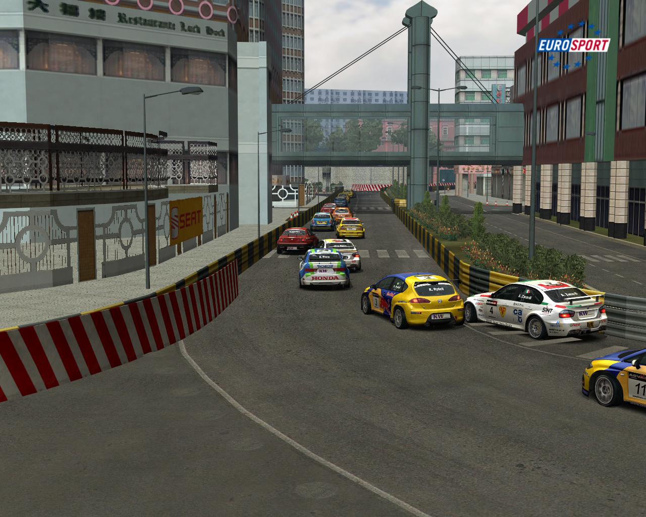 | マカオは,走っていて猛烈に面白い! 長いストレート区間を抜けて,カジノで有名なリスボアホテル前の名物コーナー「リスボアベント」へ団子状態で入っていく。ここから「山側」セクションへと入っていく |