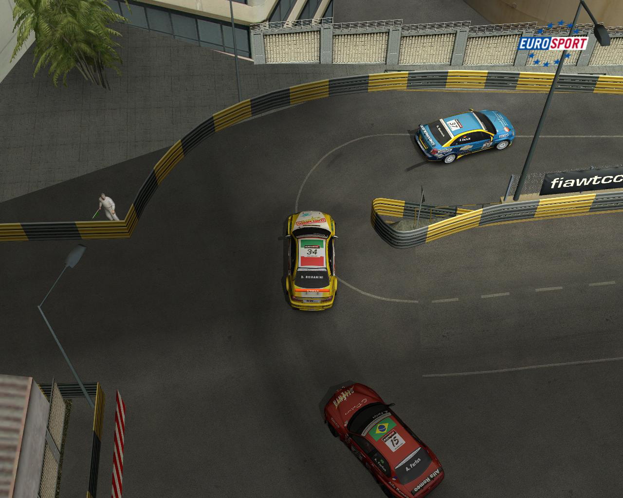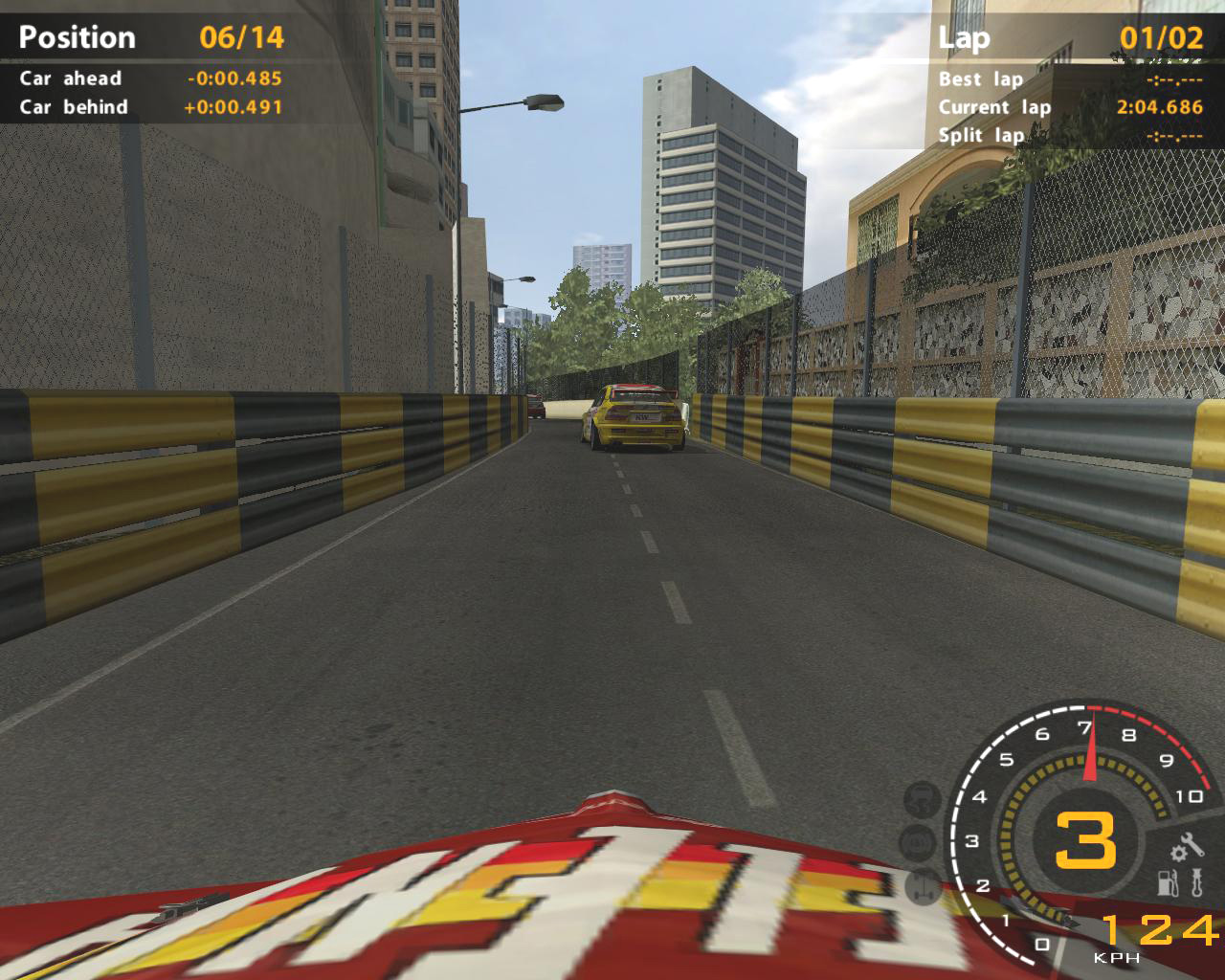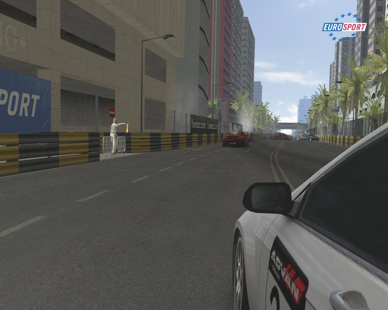 | 第1レースを優勝すると,第2レースは8番手スタートとなるこのルールが面白い。スタート直後は大混乱となるので,周りには十分注意したい | せっかくのレースシムだし,プレイ視点はコクピットビューがお勧め。車幅(とくに右側)をつかんでおかないと,接触が増えるのでご注意を | ブラインドコーナーの多いマカオでは,オフィシャルの振るフラッグにも注意。クラッシュに巻き込まれないように回避だ |
