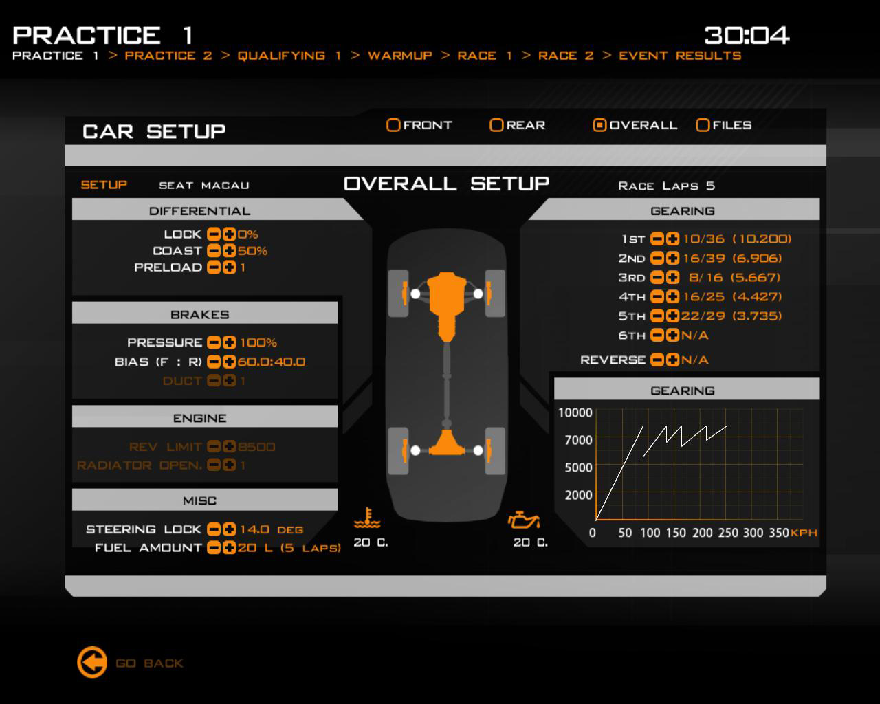 | クラッシュによるボディの凹みやパンクなどを含め,エンジン,サスペンションなどのダメージなども,走りに影響するようシミュレートされている | 足回り関係のセッティングは,フロントとリアで分かれている。FF車で重要なのは,フロントタイヤ。キャンバーをやや付けてみよう(寝かせ気味がよい) | ギア比だけは,コースに合わせて必ず設定が必要だ。ガソリン搭載量の設定は,意外と忘れがちなので必ずチェック |