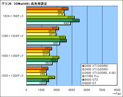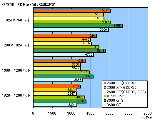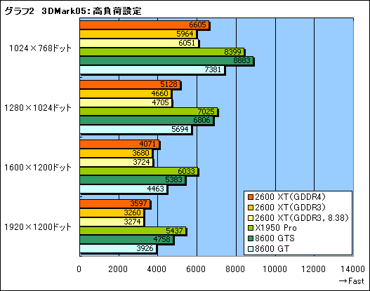 グラフ1,2を見ると,「標準設定」「高負荷設定」とも,GDDR4メモリ版HD 2600 XTはGDDR3版よりも1割ほどスコアが高い。標準設定の1024×768ドットではわずかだがX1950 Proを上回っている点にも注目したいところだ。