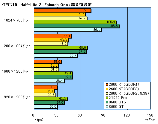 続いてATI Radeonに最適化されたFPS「Half-Life 2: Episode One」のスコアをグラフ9,10にまとめた。