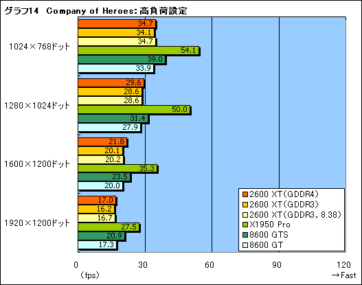 次は,プレビュー時にGDDR3メモリ版HD 2600 XTが好成績を残したRTS「Company of Heroes」(Version 1.70)のスコアを見てみよう(グラフ13,14)。