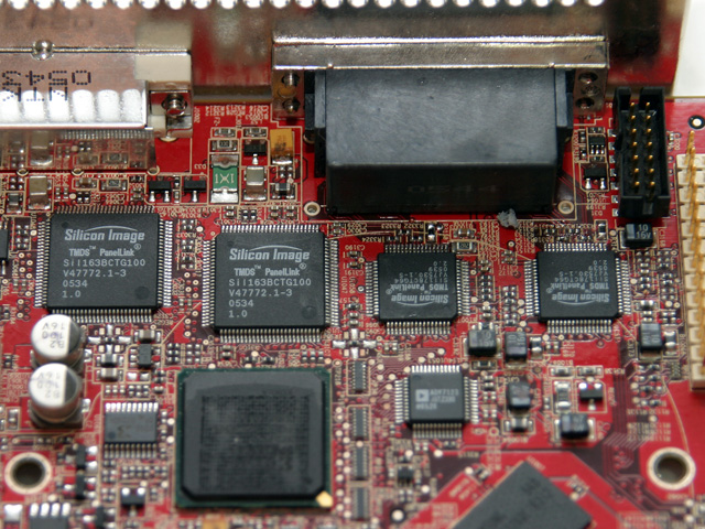 中央:Silicon Image製のTMDSレシーバ「SiI 163B」と,TMDSトランスミッタ「SiI 178」を2個ずつ搭載。SiI 178はデュアルリンクで2048×1536ドットまでサポートするから,この解像度までは出力できると思われる
