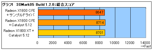 さて,前述のとおり,Radeon X1800 CFEにはサンプル版のCrossFire対応ドライバが添付されている。そこでまずはこのサンプルドライバと,正式リリース版の最新バージョンで,Radeon X1800 CrossFireはサポートしていないCatalyst 5.12との違いを見てみることにしよう。3DMark05 Build 1.2.0(以下3DMark05)で比較した結果を,グラフ1にまとめてみた。