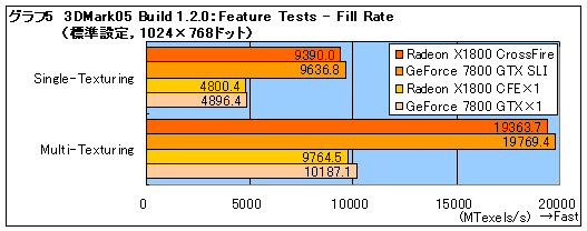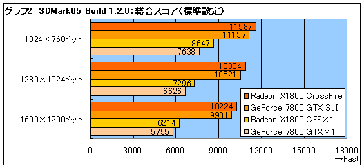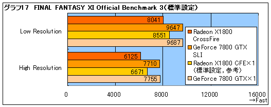 最後に,FFXIBenchの結果をグラフ17にまとめてみた。Radeon X1800 CrossFireのスコアが,シングルカード動作時と比べて明らかに下がっているのが,少々気になるところである。