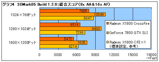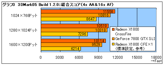 この部分を例外として考えると,Radeon X1800 CFEのシングルカードと比べて,CrossFire動作時は,高負荷環境におけるスコアの下がり幅が小さい。CrossFireに“意味がある”ことを確認できるわけである。