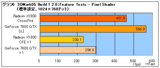 この結果について,現時点で何かを断言することはできないが,グラフィックスメモリ容量の違いが,高負荷時におけるスコアの差を生んでいる可能性はありそうだ。また,二つの256bitメモリバスを利用する「リングバスメモリコントローラ」が,Radeon X1800のスコアを押し上げている可能性もある。