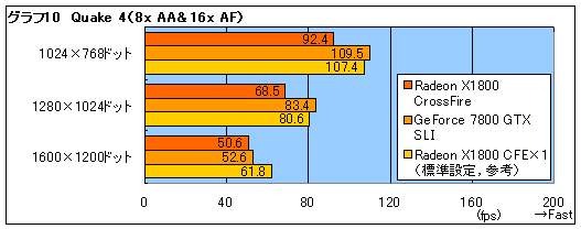 続いて,実ゲームタイトルで比較していくわけだが,最初はQuake 4である(グラフ8〜10)。一言でいえば,Radeon X1800のCrossFireは,低負荷時にGeForce 7800 GTXよりも高いスコアを見せているが,高負荷になるに従ってスコアを落としていく。今回は時間の都合で,フィルタリング精度のテストは行えていないが,パフォーマンスに限っていえば,GeForce 7800 GTXのほうが高負荷環境には強いようだ。