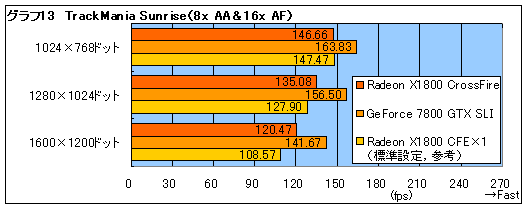 次にTrackMania Sunrise(グラフ11〜13)だが,標準設定における,Radeon X1800 CrossFireのスコアが異常に低い。これは,Radeon X850 CrossFireのときにも指摘したことだが,問題は解決していないようである。