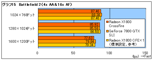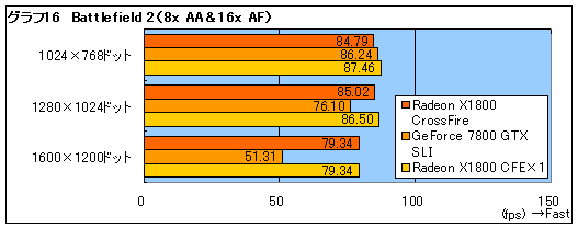 続いてBattlefield 2のテストに移ると,標準設定,4x AA&16x AFで動きが少ない(グラフ14〜16)。CrossFire/SLIを問わず,デュアルグラフィックスカードソリューションにあまりメリットがないが,これはCPUがボトルネックとなっているためだろう。
