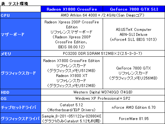 また,NVIDIA SLI(以下SLI)は,nForce4 SLIチップセット搭載マザーボードでなければサポートされないため,同一マザーボード上での比較は不可能だ。このため,CrossFireとSLIの比較は,マザーボードも含めたプラットフォームレベルのものになっているので,この点も理解しておいてほしい。