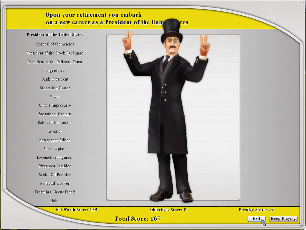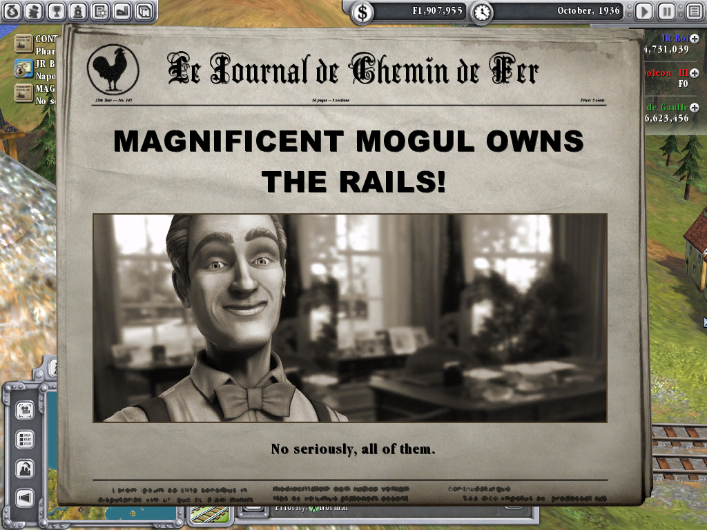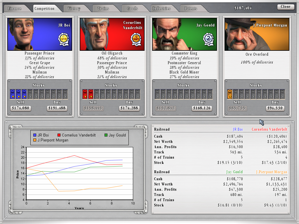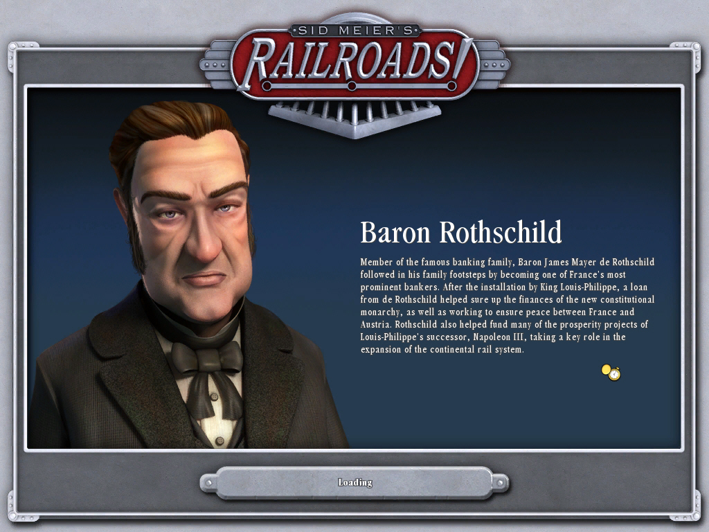 Railroads!のライバルには,金融王のJPモルガンや鉄道王のジョージ・ハドソンなどのタイクーン達,ナポレオン3世やビスマルクといった国家指導者などが,それぞれのマップに合わせて登場する。彼らライバル達との争いが,Railroads!の経済シミュレーションとしての面白さを高めており,なかなか気の抜けないレースが楽しめる。