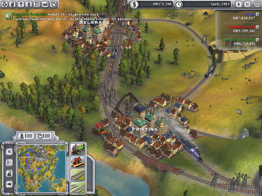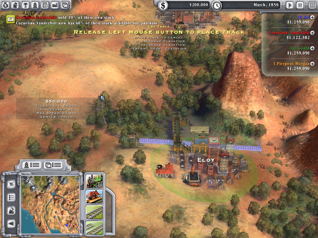 この経済戦争の中核となるのが株式の売買だ。難度が高ければ高いほど線路の施設価格が高騰するため,プレイヤーが路線を拡張するには,ゲーム序盤から株式を売却して資金を得なければならない。しかし,株式保有率が低いままゲームを進めていくと,序盤は順調に拡張できるものの,十分な資金を持ったライバルに自分の株式を独占され,やがては敵対的買収を仕掛けられる。自分の会社が他人の手に落ちるのを黙って見ているだけ,という状態に陥ってしまうのだ。株式の保有率はプレイヤーの財産総計にも関わり,それはシナリオの勝利条件に大きく影響するため,ただ闇雲に拡張するのではなく,効率良く路線を敷いていくのが大切になる。