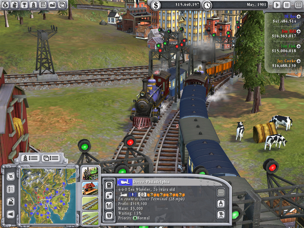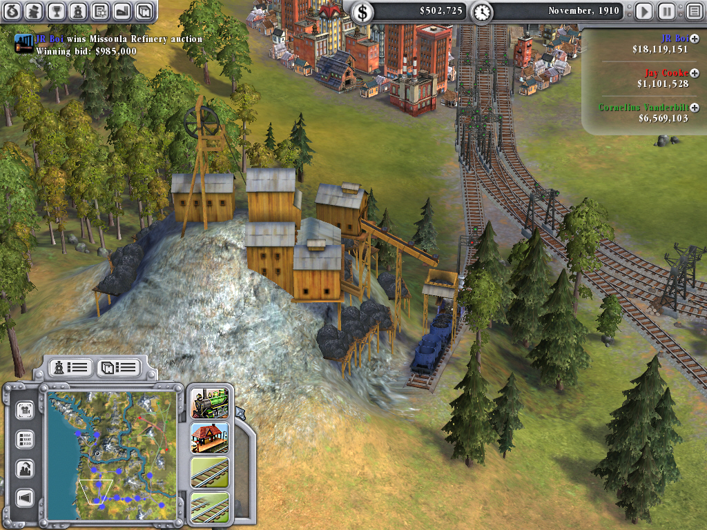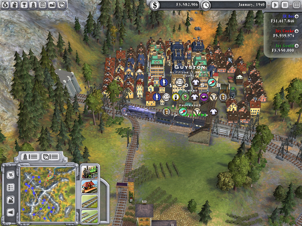 シリーズ従来作品と同じく,Railroad!では,ゲーム開始時にプレイヤーに与えられるのは,小さな町にある駅がただ一つ。とりあえず,近隣の町か工業地帯に路線を引っ張り,もう一つの駅をどこかに設置した後で機関車を購入,客車や貨車の数を決めて運航を開始するという手順になる。乗客や物資が盛んに行き来することで,町は都市になり,やがて大都市へと成長し,より多くの物資を消費するようになる。