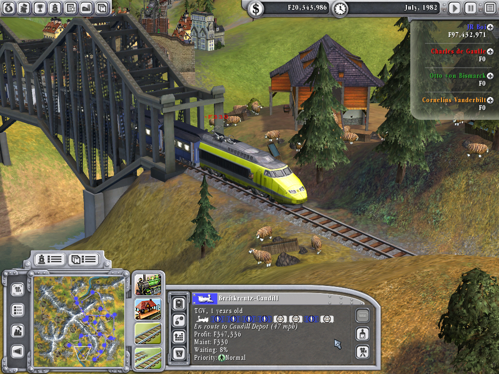 | Railroads!には,画面にあるような高速列車TGVを頂点に,総計46種類の機関車が登場する。プレイヤーが運転手の視点で列車を動かすことはできないが,カメラを特定の列車に固定して,ただ眺めているだけでもかなり楽しい。水面に揺れる鉄橋の影や,運転手や駅の乗客までが描かれているほどグラフィックスは細かく,車両の色やロゴなどの変更も可能だ |