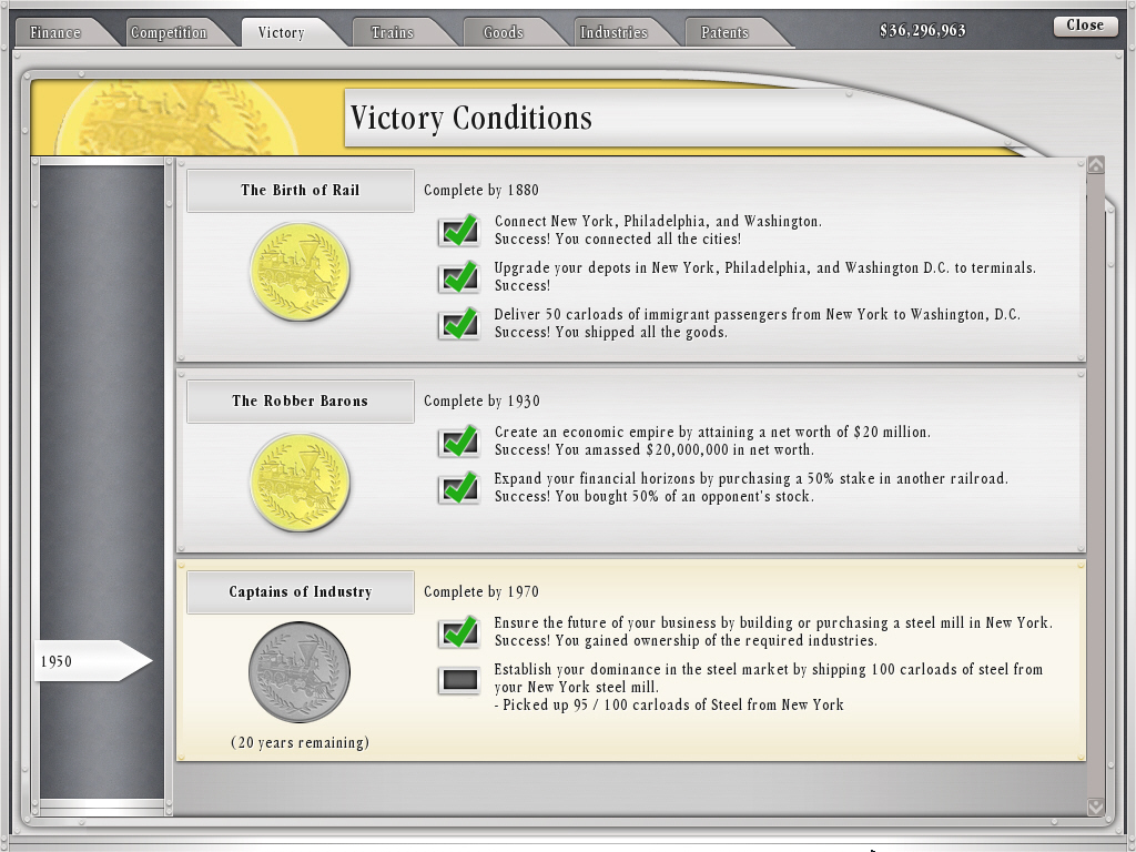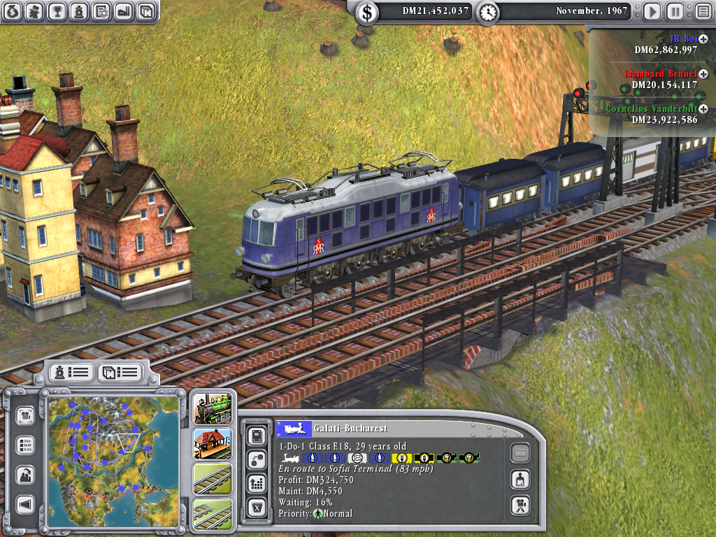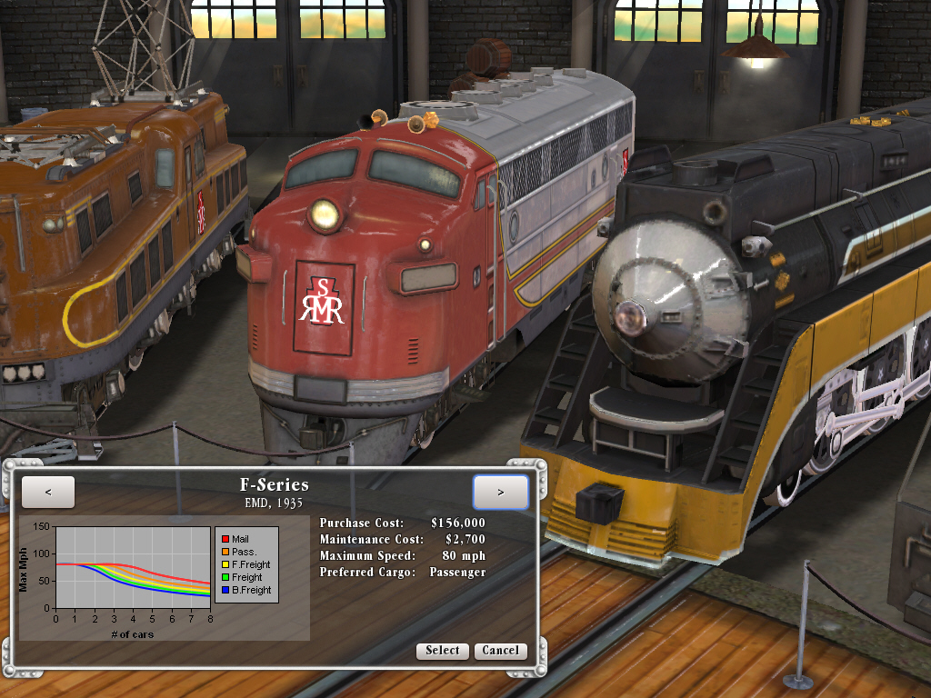 歴史的な区分としては,蒸気機関車が一般に使用され始めた1830年から,高速の電気機関車もお目見えする1970年までの140年間で,マップごとに,開始から終了までの期間が異なる。ミッションクリア型のゲームシステムではあるが,どのマップを選ぶかはプレイヤーの自由である。前作とは異なり,日本の新幹線はおろか,アジアのマップが一枚もないのが残念だが,これは「鉄道で一儲け」という,19世紀末〜20世紀の欧米におけるアメリカン(ヨーロッパもだが)ドリームにテーマを絞っているからだろう。
