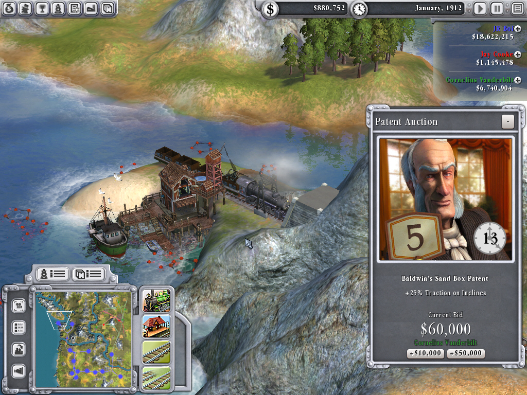 | ランダムに発生する“パテント・オークション”は,特定の技術を10年間独占的に使えるというもの。街の工場の買収など,ライバル達との何かしらの争奪戦が常に繰り広げられ,それがゲームを白熱させるのだ。ゲーム後半で資金が十分に貯まれば,ライバル会社をそのまま買収し,合併するか廃線にしてしまえる |