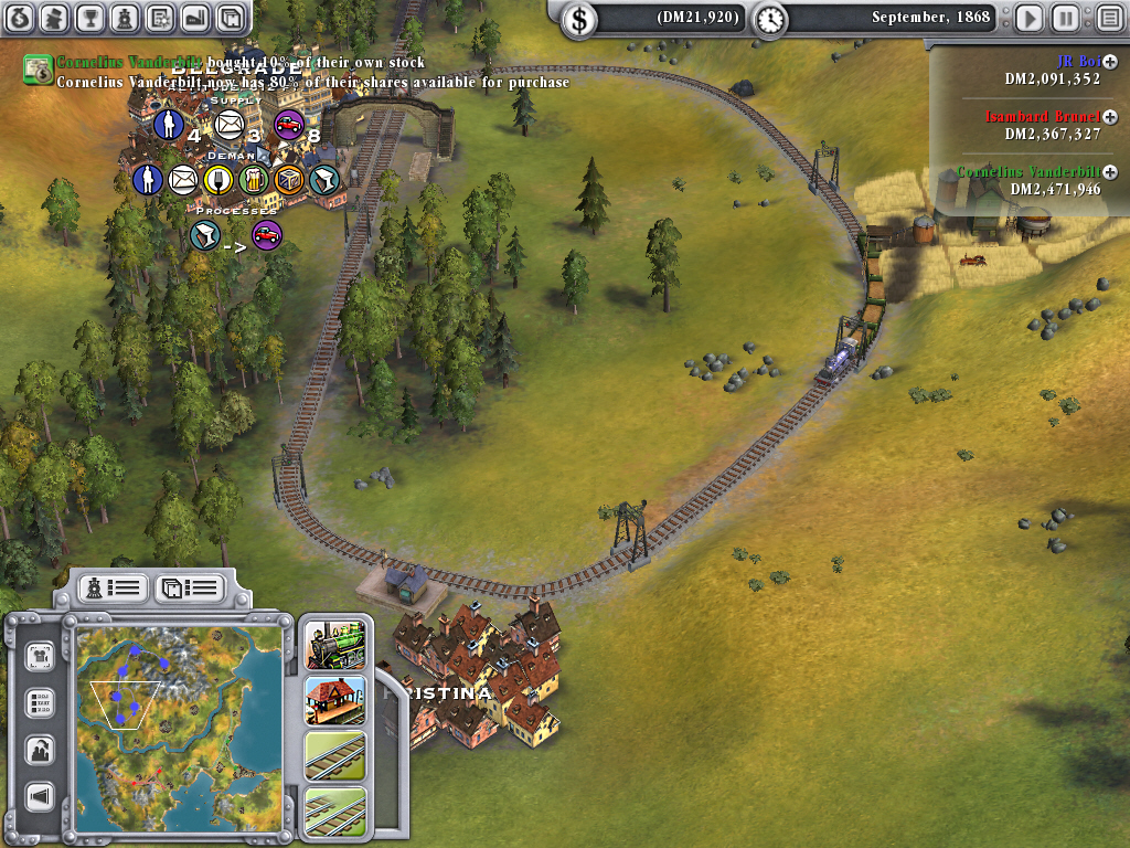 「ランダム設定」にしなければ,マップの地形や町の位置などは常に同じである。ただし,工業地帯や町の工場などは必ず異なる場所に出現するので,基本的に「どこをどのようにつないでいくか」という戦略性が,このゲームの眼目になっている。マップの生成時点で決定されるプレイヤーの拠点駅周辺の町や工業地帯の数が,後々のゲームの展開に大きく影響していく。ある程度,先のことまで考えて路線を敷設しなければならないのだ。