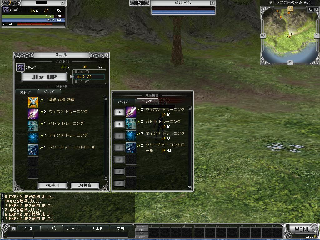 キャラクターは経験値取得による一般的なキャラクターレベルのほか,「ジョブレベル」によって成長していく。ジョブレベルは,敵モンスターを倒すことによって経験値とともに得られる「ジョブポイント」を消費して上げていくのだが,これがなかなかの曲者。というのもジョブポイントはアクティブ/パッシブを問わず,各種スキルのレベルアップ時にも消費するのだ。また新たなスキルを習得するためには一定のジョブレベルが必要となり,さらにスキル体系はツリー状となっているため,上位スキルを習得するためには,特定の下位スキルを一定のレベルまで上げなければならない。