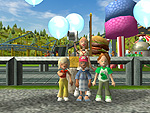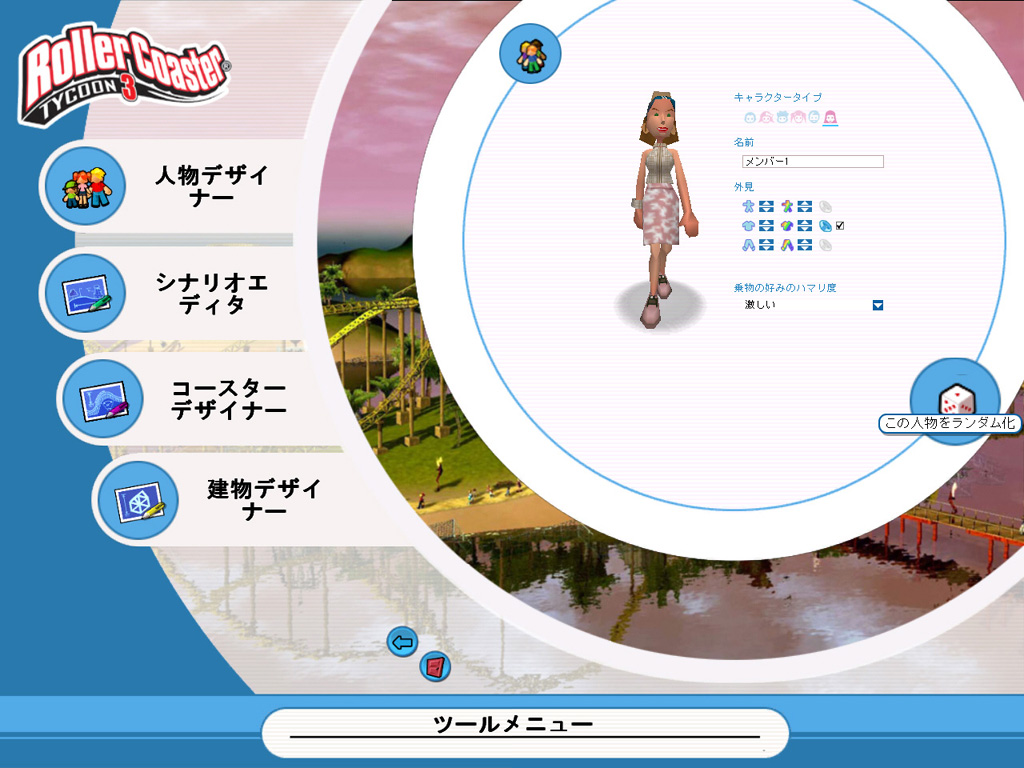 | コースターデザイナーを使い,独自レイアウトのコースを作成&保存してゲームで使うのが基本的パターン | 人物デザイナーでピープを作成し,カップルや家族などグループ化しておくと,プレイ中の遊園地に遊びにくる | 作成したグループは遊園地に設置した撮影ポイントで写真撮影。画像ファイルとして保存される |