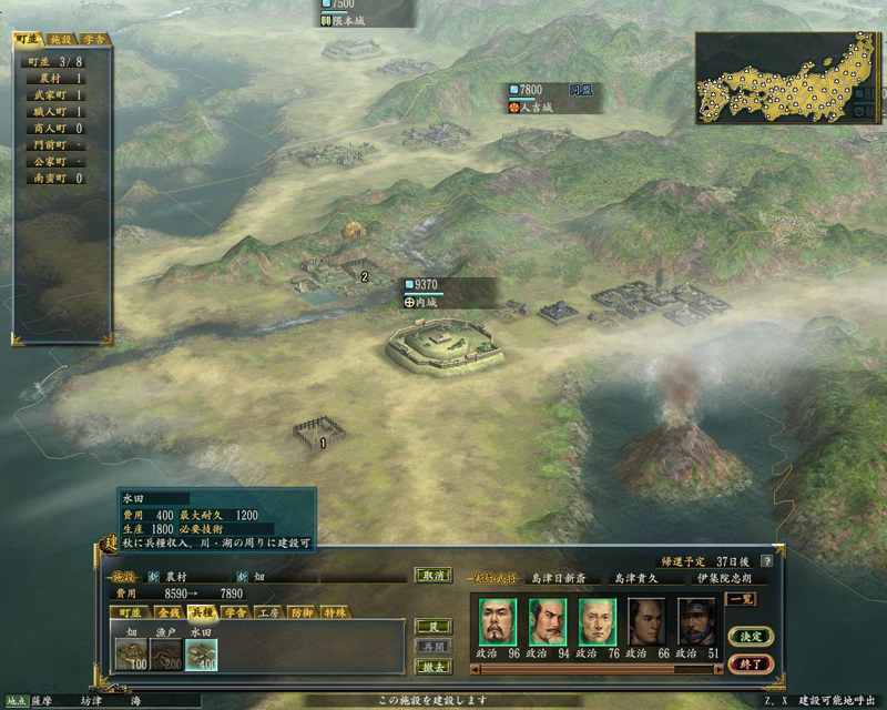 施設の建設は町並を建設することから始まる。町並「農村」を建てれば周囲に「水田」や「畑」が建設できるようになり,これらから兵糧収入を得られる。そして町並「商人町」を建てれば周囲に「市」や「商館」が建設可能になり,これらから金銭収入を得られる,といった具合だ。このほかにも施設には「募兵」をして兵力を増やせるようになる「兵舎」や,技術を開発するのに必要な「○○学舎」(○○の部分には,「鉄砲」や「騎馬」など技術の種類が入る)といったものもある。