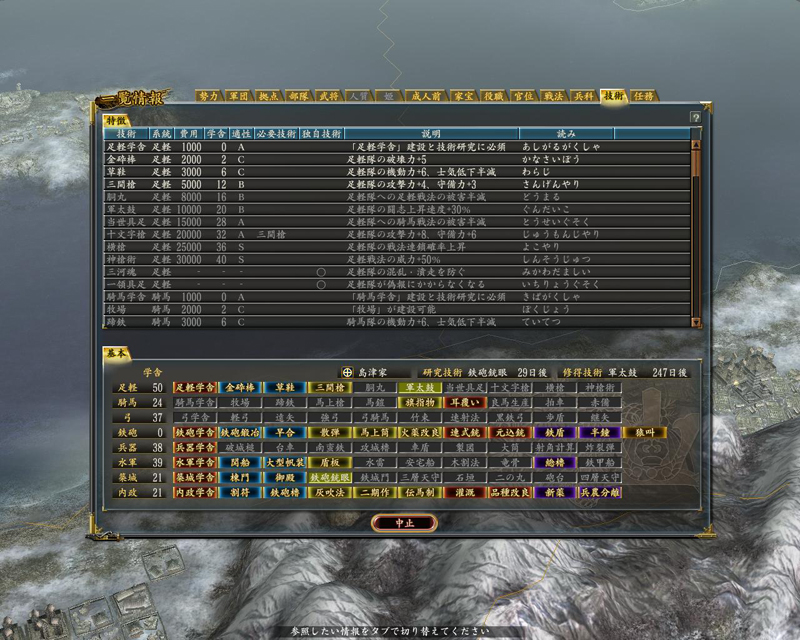 このように,技術は「革新」において非常に重要である。今回の「革新」では,戦法以外の攻撃や防御といった部隊の能力は大名家の所有技術によってのみ決まり,武将の強さには依存しない。いくら武将の戦法が強力であろうとも,保有技術が少なければ宝の持ち腐れなのである。「革新」で用意されている技術は全部で8系統80種類以上。合戦に関するものだけでなく,春と秋に水田からの兵糧収入が得られる「二期作」といった内政の技術もある。
