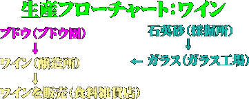 ワインは,ブドウとガラス(瓶)を組み合わせることで生産される。ブドウはブドウ園で栽培することで得られ,ガラスは石英砂を採取し,それを工場で加工することで得られる。フローチャートでまとめるとこうなる。
