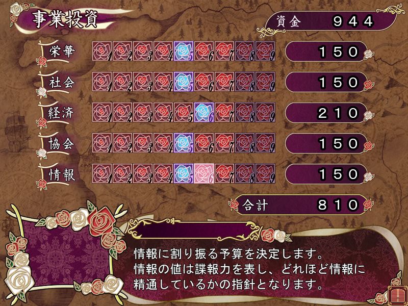 それに対し本作では,いわゆる内政の部分を,一ヶ月に一度行う税率変更と,資金を各分野に対してどの程度投資するか,という2点のみに絞っている。しかも,税率は通常,軽微,重課,の3つからの選択。投資についても,10段階のうち,どの段階まで投資するか選択するだけで,実際に数値を入力して細かく指示する必要はないのだ。