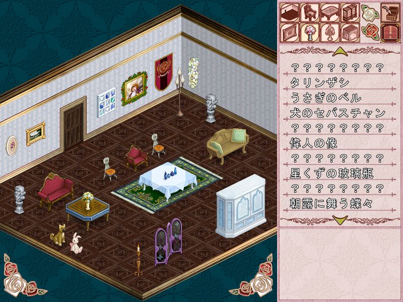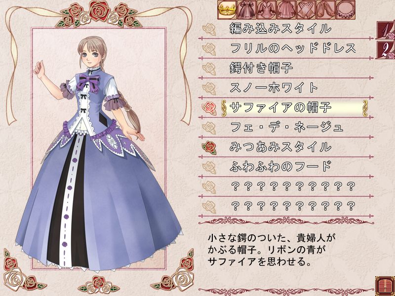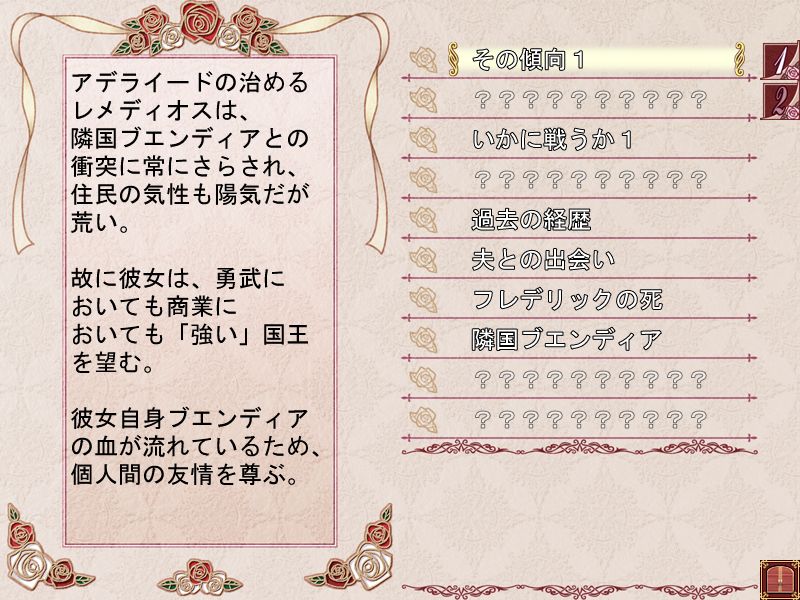 最後に,「コレクション」についても述べておこう。王女には自領の発展に応じて,内政資金とは別に,自由に使用できるお金,いわばお小遣いが与えられる。このお小遣いは,商人から「秘密」や「衣装」,「家具」といったものを購入するために使用する。「秘密」を購入すれば,各キャラクタのプロフィールを知ることができるし,「衣装」や「家具」は,主人公の着せ替えや自室の模様替えに使用すること出来るのだ。プロフィールは,そのキャラクタの信頼を得るためのヒントが記載されていることもあるため,積極的に購入していきたい。一方で,衣装や家具は完全におまけ要素。購入して身に付けたり部屋の模様替えをしても,本編のCGに反映されるわけではない。しかし,購入品目は全てリスト化されるので,リストを埋めていく楽しみを見出すこともできるのだ。