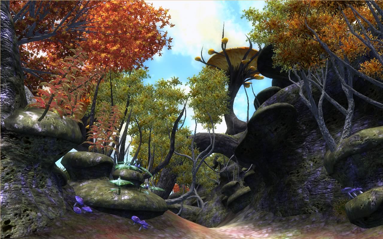 Shivering Islesの大きさはCyrodiilの4分の1程度である(Oblivionをプレイした経験のない方のために,キャラクターを走らせて実時間を計測した。島の外周を道なりに一周して約15分。諸々の条件によってスピードの増減はあるが,目安として捉えて頂きたい)。この島は南北で様相が異なる。南側が,視認性が低く陰湿な沼地が点在する「Dementia」サイド,そして北側が,シュールで色彩豊かな植物が生い茂る「Mania」サイドとなっていて,それぞれが独自の雰囲気を持っている。