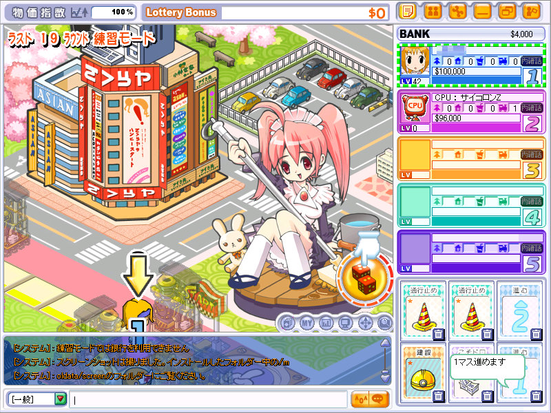 ゲームの基本的な流れは順番にサイコロを振り,空いている土地のマスに止まれば購入して自分の土地とする事ができ,他人の土地のマスに止まった場合は持ち主にお金を払わなければいけない。こうしてお金を取ったり取られたりして,最終的にライバルを破産させれば勝ちとなる。
