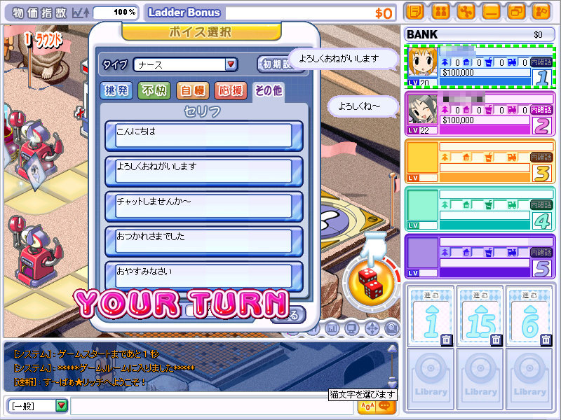 ところで,このゲームにはなかなか面白いコミュニケーション機能がついている。一般的なチャットに加え,猫の顔をモチーフとした顔文字を表示できる「猫文字」,そしてロビーでは使用できずゲーム中のみとなるが,各種キャラクターの声で選択した言葉をしゃべらせる事ができるボイス機能があるのだ。