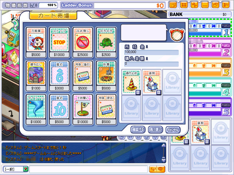 カードはスタート時にランダムで配布されるほか,カードの置いてあるマスに止まって入手するか,カード屋に止まれば品揃えの中から選んで買うことができる。ただしカード屋の品揃えは毎回変化するので,その時の所持金と相談してどのカードを買うかの判断も重要となる。