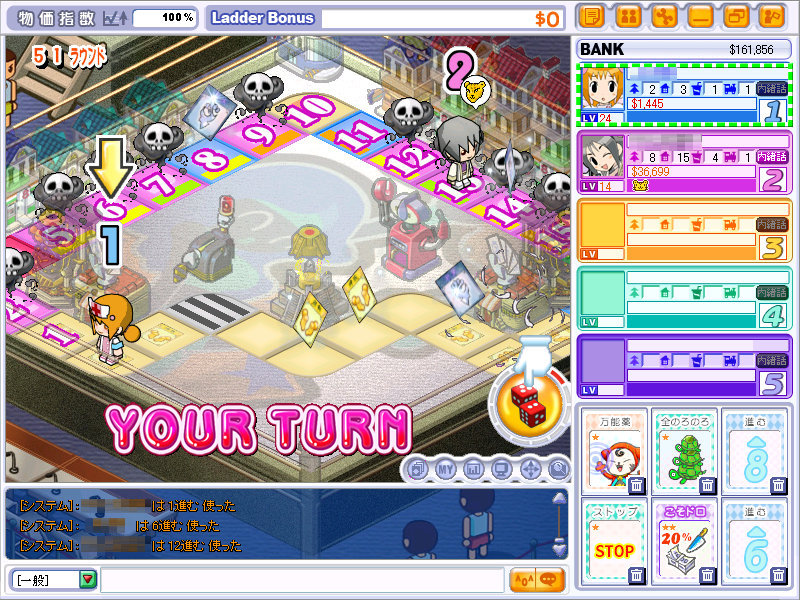 例えば,「のろのろ」と「チーター」という2種類のカードがある。これらはカード屋で非常に安く購入できるのだが,例えば「のろのろ」は2つのサイコロの目を必ず1か2にしてくれる。つまり,サイコロの目の合計が2となる確率が25%,3となる確率が50%,4となる確率が25%あるわけだ。このような特徴を理解して使っていく事により,出費を極力抑えながらも,止まりたいマスを狙っていく事が可能となる。