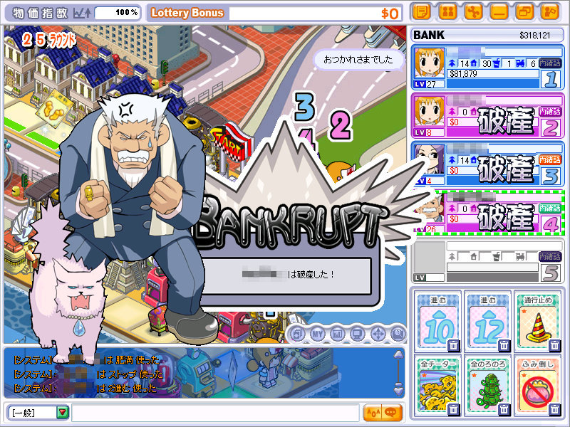基本的に現金は相手から奪い取る事でしか大きくは増やせず,また現金だけたくさん持っていてもあっという間に取られてしまう事がほとんどなので,このゲームにおいては「お金は貯めるもの」ではなく「ライバルを破産させるための手段」として有効に使っていくことが勝利への近道となる。