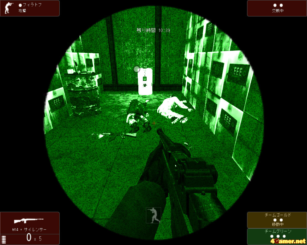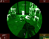 暗いところでは暗視ゴーグルが便利だが,視界が狭まり,また画面が荒くて見にくくなる。かなりリアルっぽい |
